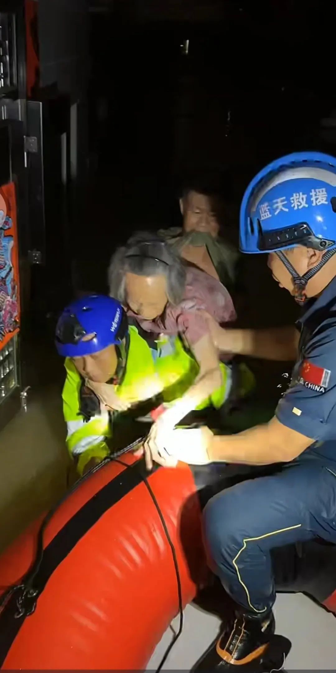 蓝天救援队的冲锋舟在转移祖孙三人时,多次遭漂浮杂物撞击。救援队员一手护着群众,一手奋力拨开障碍物,最终将三人安全转移。直播弹幕瞬间被“致敬!”“注意安全!”的留言刷屏。