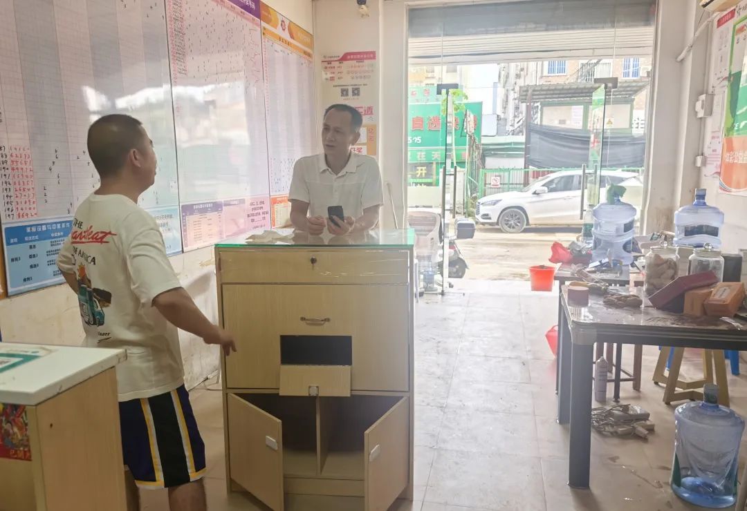 东莞体彩中心工作人员向受灾实体店代销者详细了解实体店受灾情况和当前生产经营状况,询问需要帮助解决的问题,并鼓励代销者克服目前暂时性的困难、重拾信心,尽快恢复生产经营。