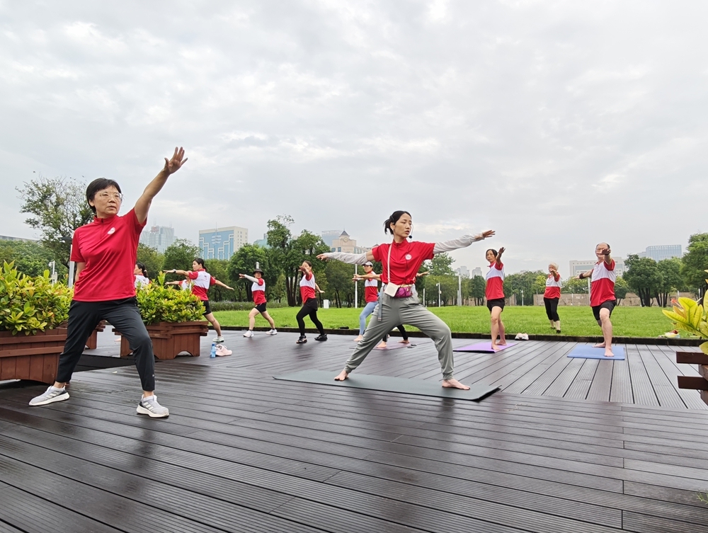 短暂休息后,捡跑队伍中的瑜伽教练“嘟嘟”,将大家引至公园一角被绿树与花草环绕的平台。在这里,一节与自然同频的户外瑜伽课悄然开启。“吸气,双臂向上延伸;呼气,身体缓慢前屈……”跟随“嘟嘟”轻柔的口令,志愿者们舒展肢体,深嗅草木清香,耳畔是鸟鸣婉转,仿佛身心正与这片绿意静静交融。