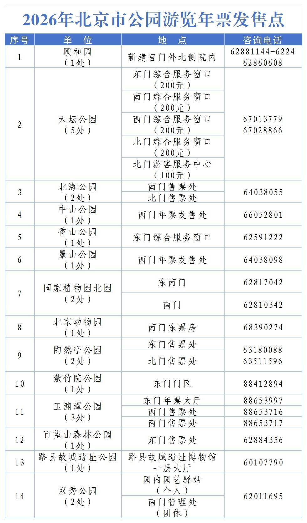 rrrrr北京市公园游览年票(100元)适用颐和园、天坛公园、北海公园、中山公园、香山公园、景山公园、国家植物园北园、北京动物园、陶然亭公园、玉渊潭公园、百望山森林公园、双秀公园、北京国际雕塑公园、大观园、地坛公园、水立方。使用时限为2026年1月1日到2027年1月31日。