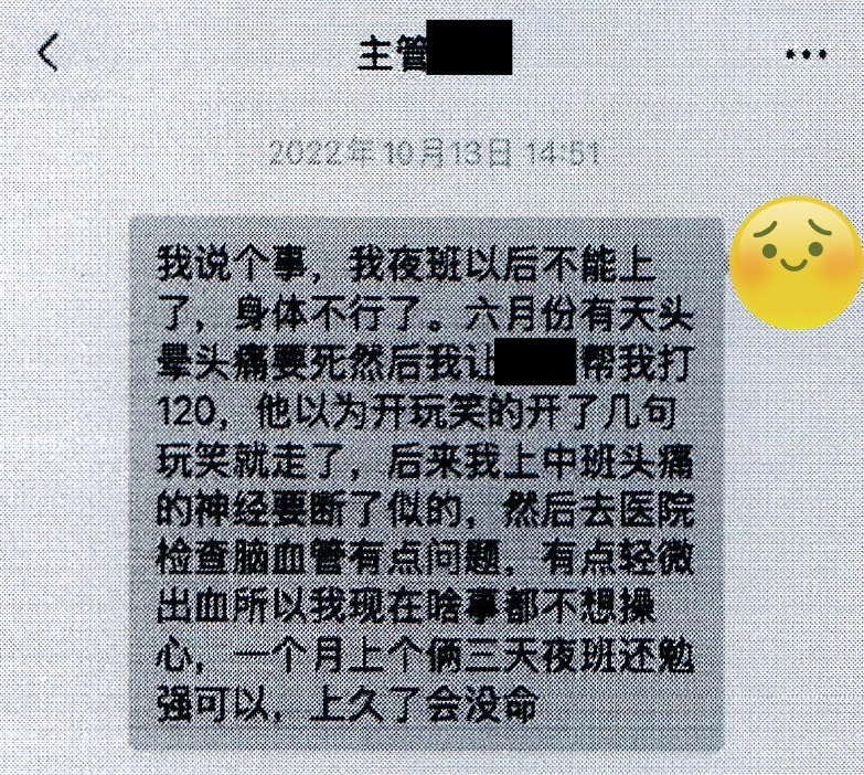 “当时他因为生病的原因晚上睡不好觉,精神状况看上去很不好。他也一直在跟我说自己不能熬夜了,身体真的吃不消。”魏某的代理律师告诉记者,魏某拒绝了夜班安排,但坚持白天出勤。